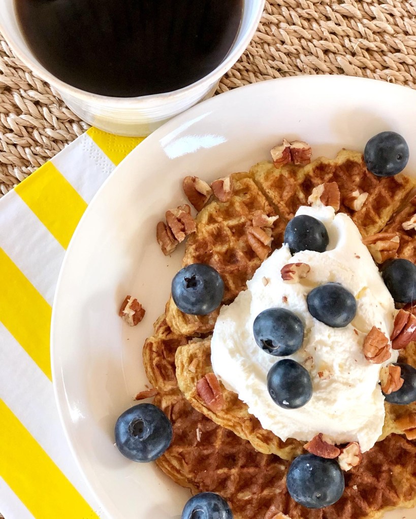 Murskaa banaani ja sekoita ainekset yhteen. Paista kookosöljyssä vohveliraudalla tai pannulla. Laita lautaselle, lisää paksua (10 % rasvaa) luonnonjogurttia, pähkinöitä, pähkinätahnaa ja marjoja, nauti!