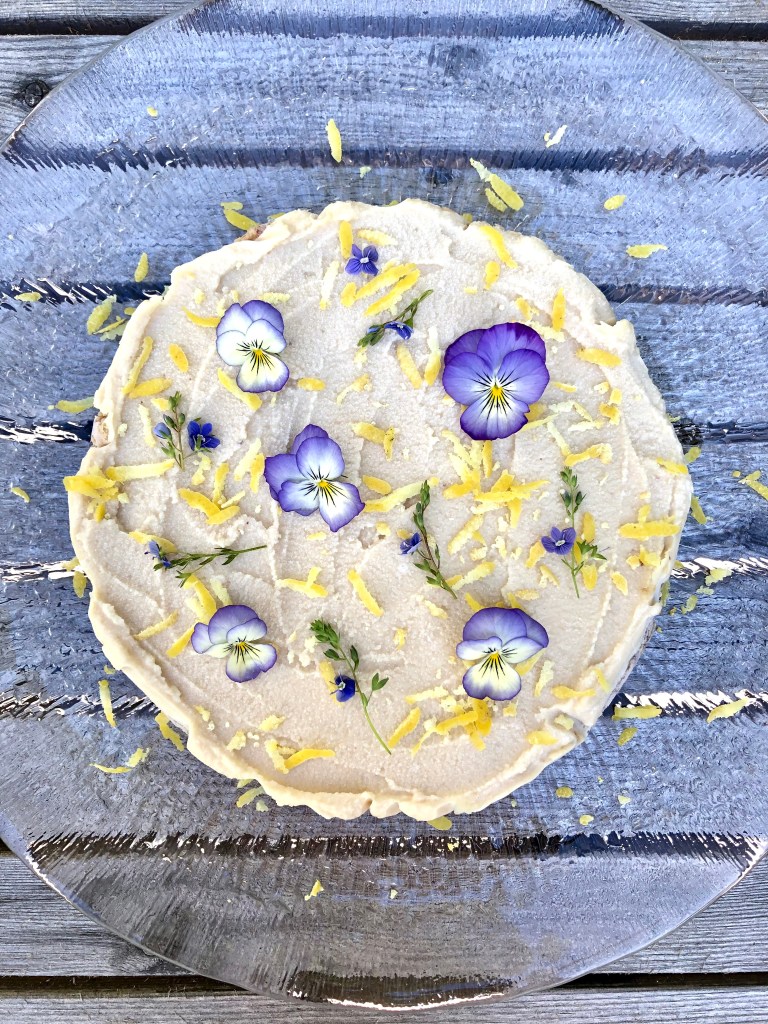 Laita tehosekottimeen kaikki täytteen ainekset ja hurauta tasaiseksi seokseksi. Levitä pohjan päälle ja laita pakastimeen vähintään muutamaksi tunniksi. Koristele halutessasi raastetulla sitruunankuorella ja syötävillä kesäkukilla.
