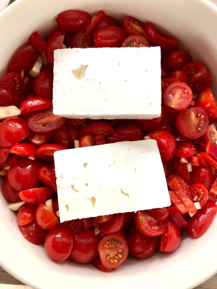 Tämä on tosi helppo ja super maukas ruoka, joka valmistuu uunissa melkein itsestään. Feta sulaa täydelliseksi, kirsikkatomaatit pehmenevät, chili antaa potkua ja oliiviöljyä ei pidä säästellä! Lämmin suositus, jos et ole vielä kokeillut!