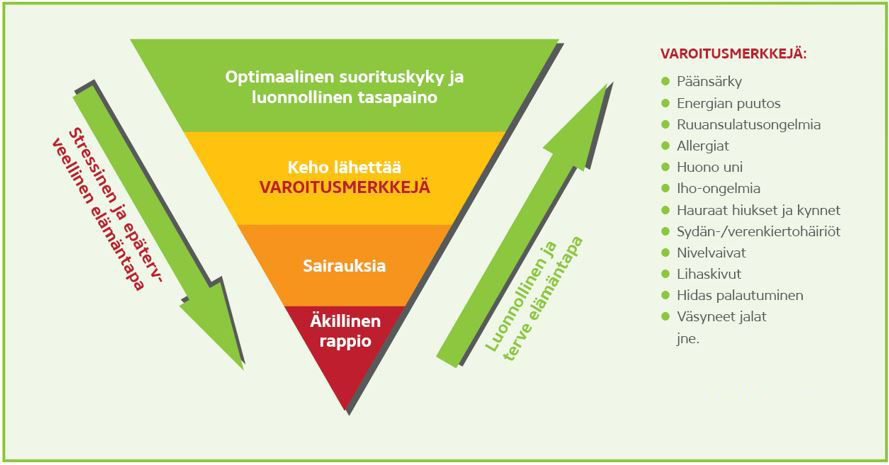 Väsymys, haluttomuus, yleinen huono olo, päänsärky, unettomuus, suolisto-ongelmat, ylipaino, epämääräisiä kipuja… Helposti sivuutamme nämä kehon hälytysmerkit ja kuittaamme ne särkylääkkeillä, antibiooteilla, juomme väsymykseen kahvia tai energiajuomia ja ajattelemme oireiden kuuluvan ikään tai elämään yleensä. Omaan oloon tottuu, ja tyydymme siihen mitä on.